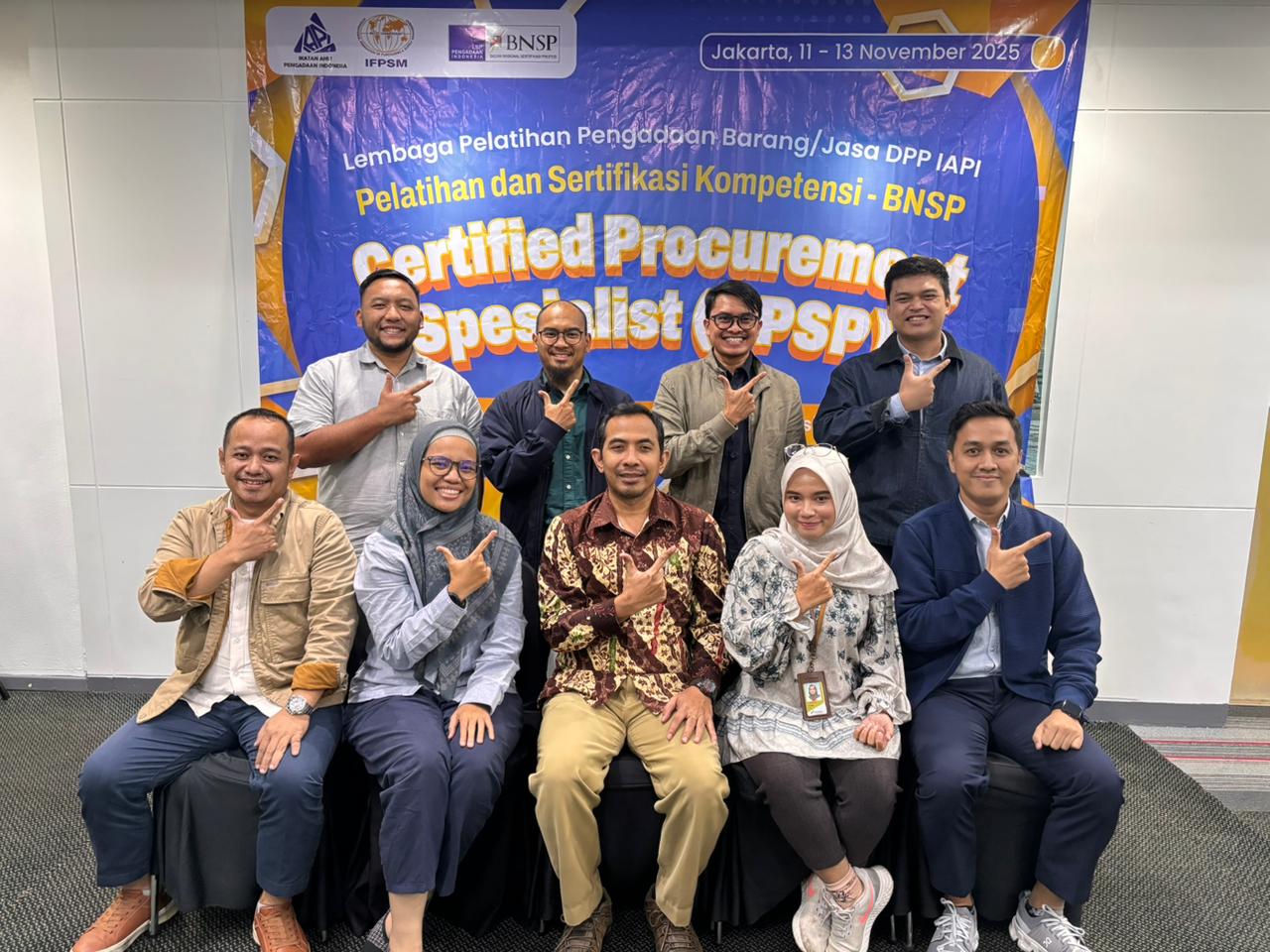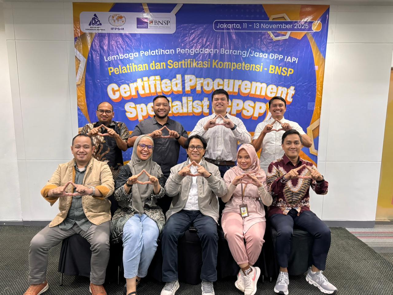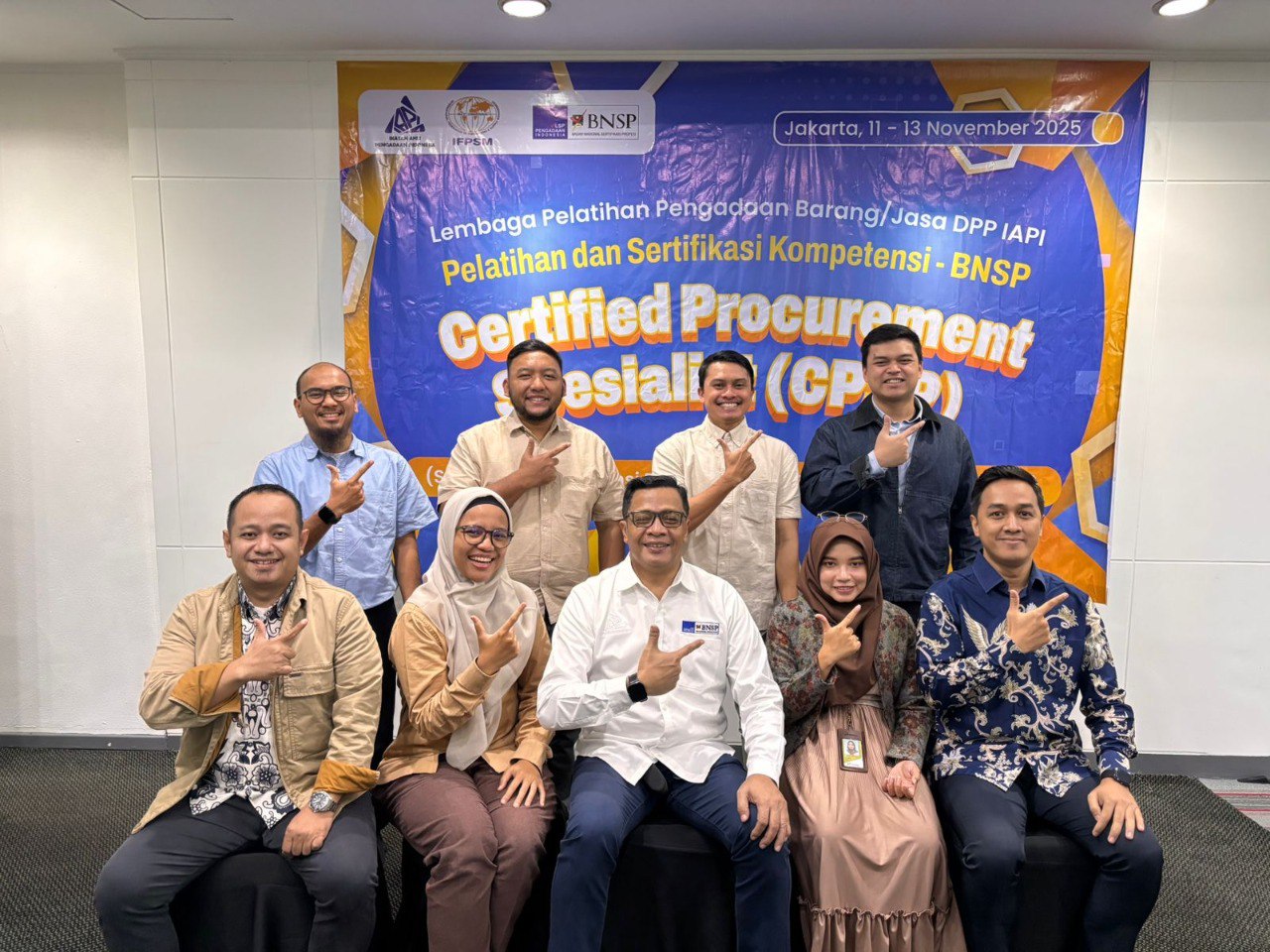 Pelatihan dan Sertifikasi Kompetensi Pengadaan Barang/Jasa Pemerintah skema Certified Procurement Specialist (CPSP) Batch 1 yang diselenggarakan oleh Ikatan Ahli Pengadaan Indonesia (IAPI) bersama LSP Pengadaan BNSP berhasil dilaksanakan pada 3 sd 13 November 2025 melalui metode E-Learning, tatap muka, dan ujian sertifikasi di Hotel Asyana Kemayoran Jakarta. Kegiatan dimulai dengan pembelajaran online yang membahas materi fundamental seperti menelaah lingkungan pengadaan, penyusunan kebutuhan dan anggaran, serta spesifikasi teknis hingga pengkajian ulang paket pengadaan. Pembelajaran tatap muka pada 11 sd 12 November berlangsung interaktif dengan pendalaman materi memilih penyedia, penyusunan dokumen, evaluasi kualifikasi dan kinerja penyedia, hingga simulasi negosiasi yang difasilitasi oleh praktisi berpengalaman. Puncaknya, para peserta mengikuti uji kompetensi tertulis dan wawancara CPSP BNSP pada 13 November 2025. Keseluruhan rangkaian kegiatan berjalan lancar dan sukses, menegaskan komitmen IAPI dalam meningkatkan profesionalisme dan kompetensi SDM pengadaan di Indonesia.