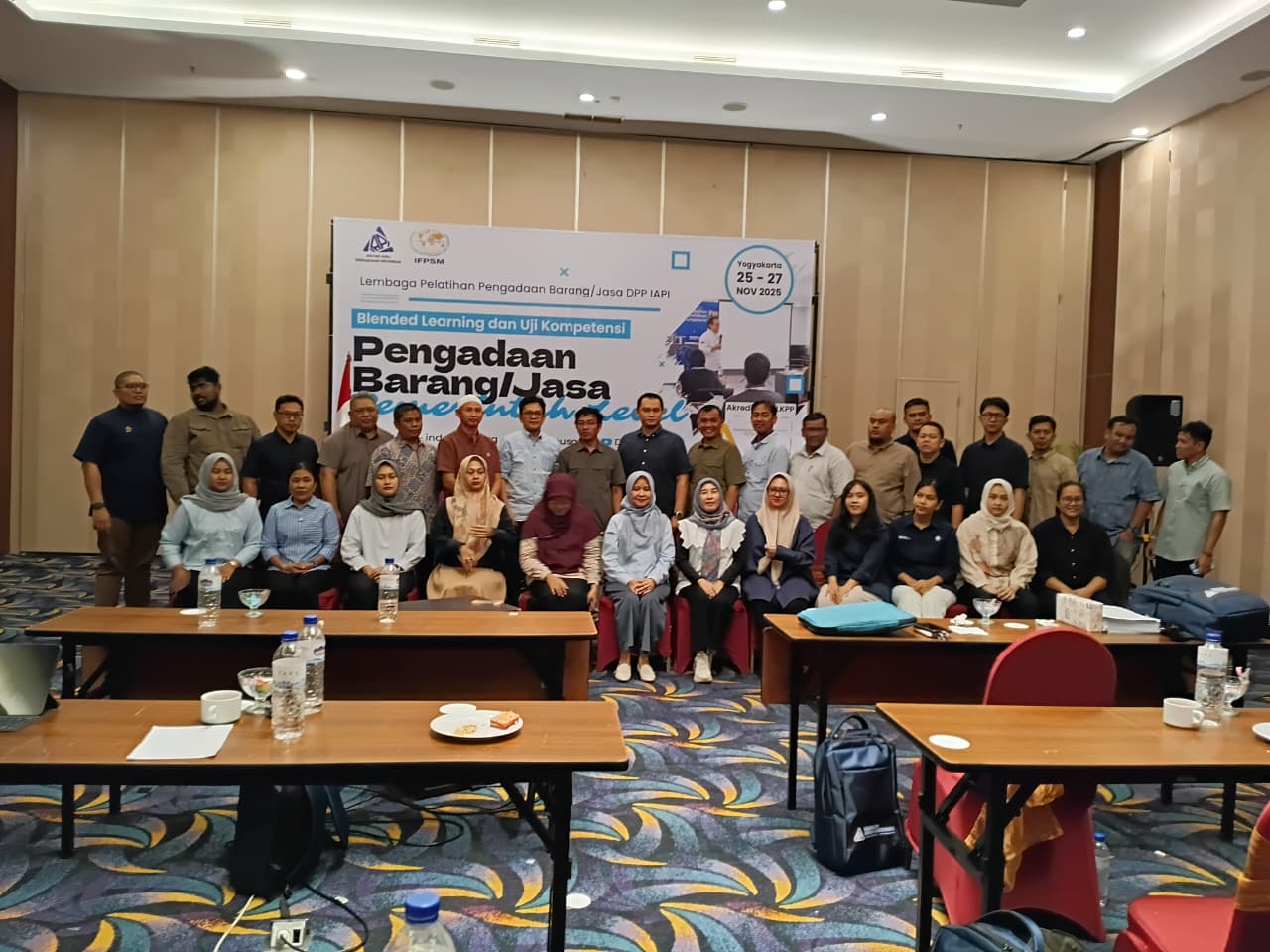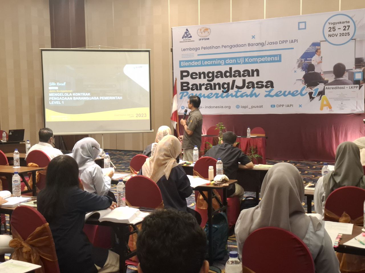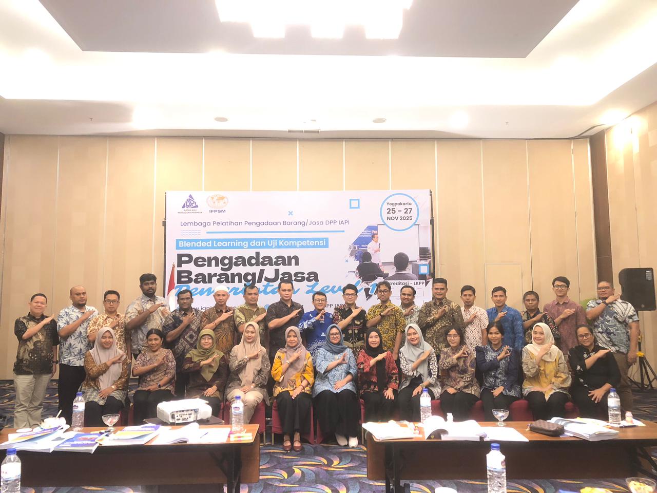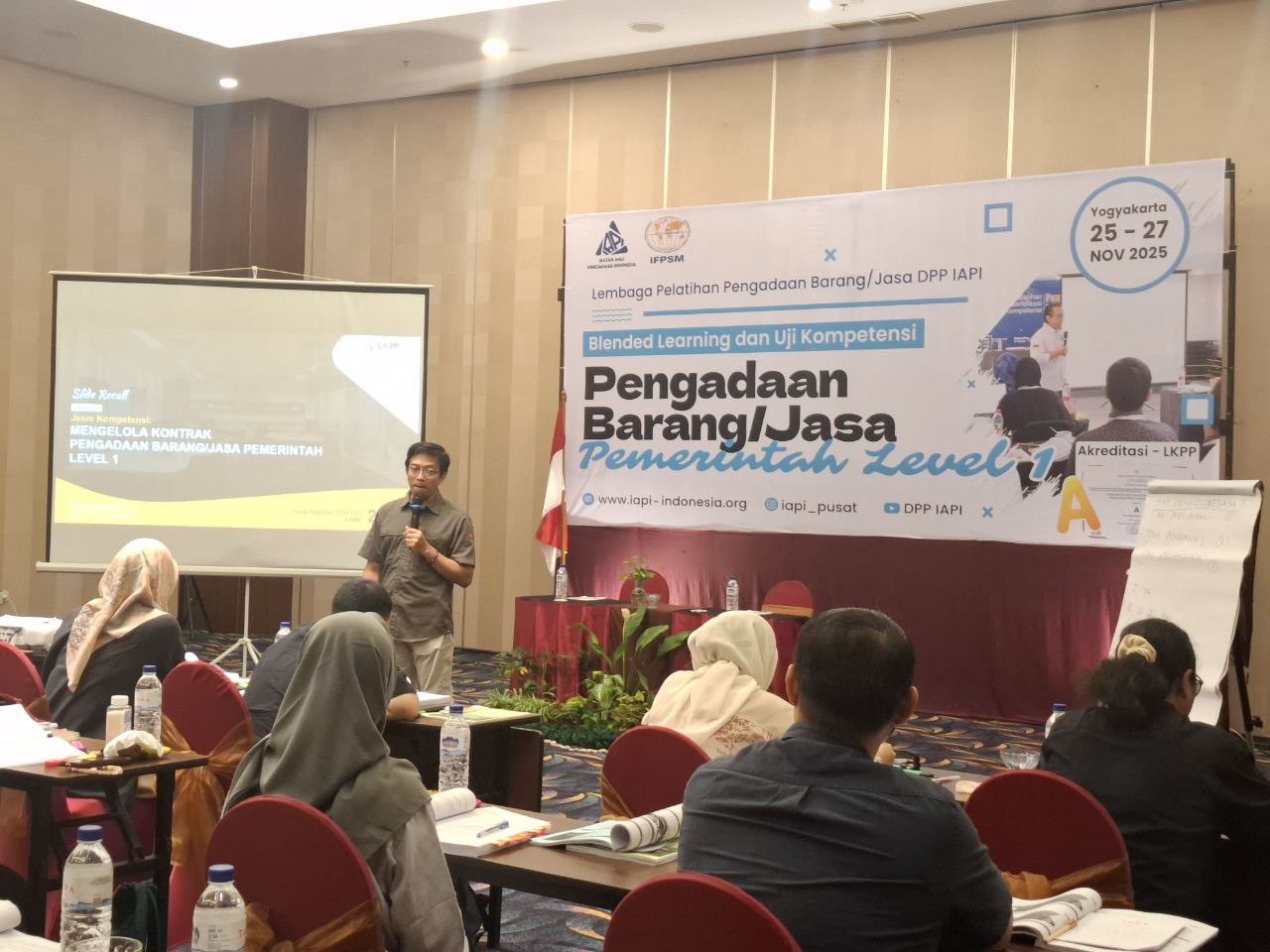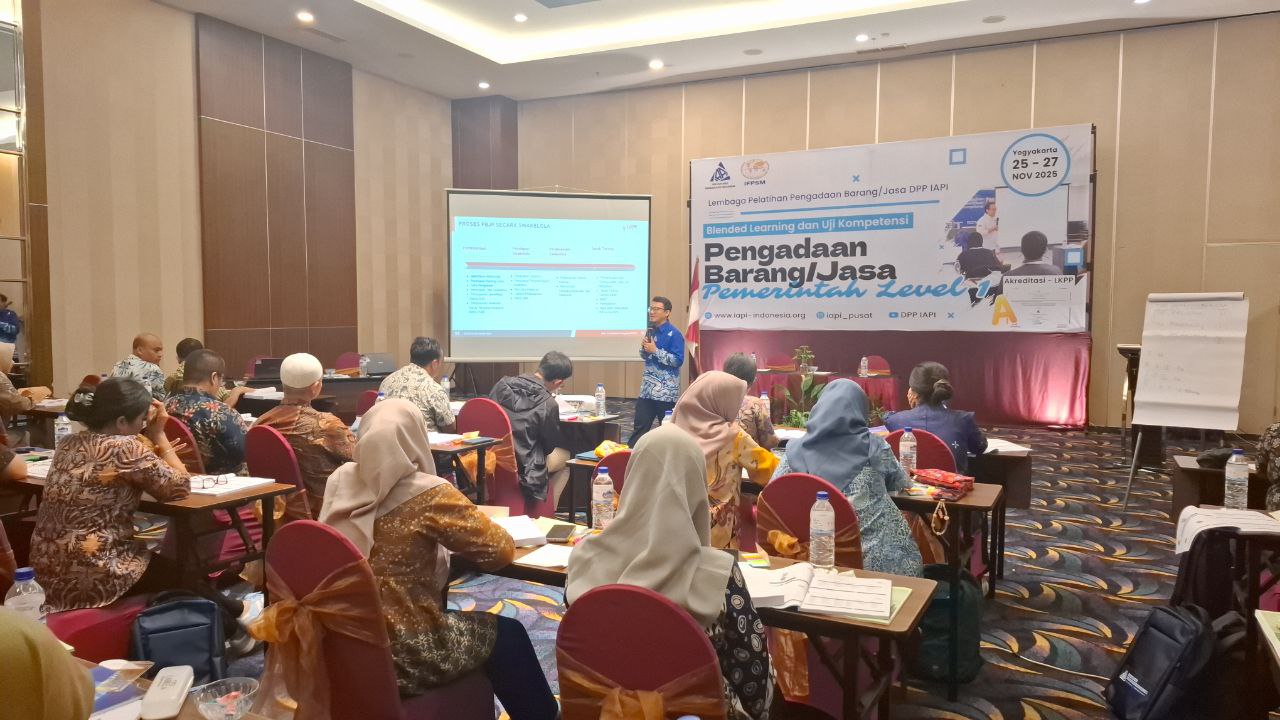 Pelatihan dan Sertifikasi Kompetensi Pengadaan Barang dan Jasa Pemerintah Level 1 yang diselenggarakan oleh Ikatan Ahli Pengadaan Indonesia pada tanggal 25 sampai 27 November 2025 di Tara Hotel Yogyakarta berlangsung dengan sukses dan diikuti oleh peserta dari berbagai instansi. Selama dua hari tatap muka, peserta mempelajari materi yang sangat komprehensif mulai dari pengantar pengadaan barang dan jasa pemerintah, perencanaan, pemilihan penyedia, pengelolaan kontrak, swakelola, hingga konsep manajemen rantai pasok yang dipandu oleh fasilitator ahli bersertifikat LKPP. Kegiatan ini ditutup dengan ujian sertifikasi Level 1 yang diawasi langsung oleh Direktorat Sertifikasi Profesi LKPP sebagai bentuk evaluasi akhir terhadap kompetensi peserta dalam memahami prinsip, tahapan, dan praktik pengadaan yang profesional dan akuntabel sesuai regulasi.
